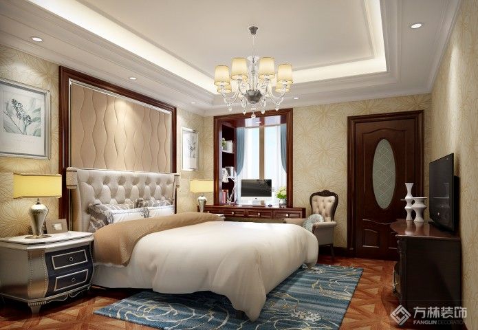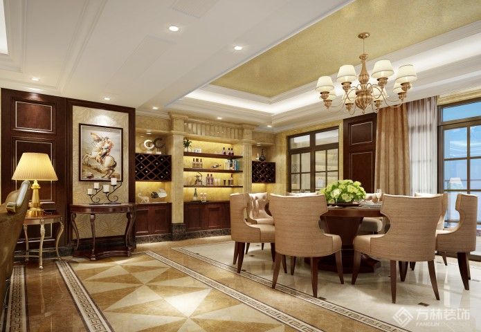 设计理念:古典欧式风格装修最大的特点是在造型上极其讲究,给人的感觉端庄典雅、高贵华丽,具有浓厚的文化气息。在家具选配上,一般采用宽大精美的家具,配以精致的雕刻,整体营造出一种华丽、高贵、温馨的感觉。在配饰上,金黄色和棕色的配饰衬托出古典家具的高贵与优雅,赋予古典美感的窗帘和地毯、造型古朴的吊灯使整个空间看起来赋予韵律感且大方典雅,柔和的浅色花艺为整个空间带来了柔美的气质,给人以开放、宽容的非凡气度,让人丝毫不显局促